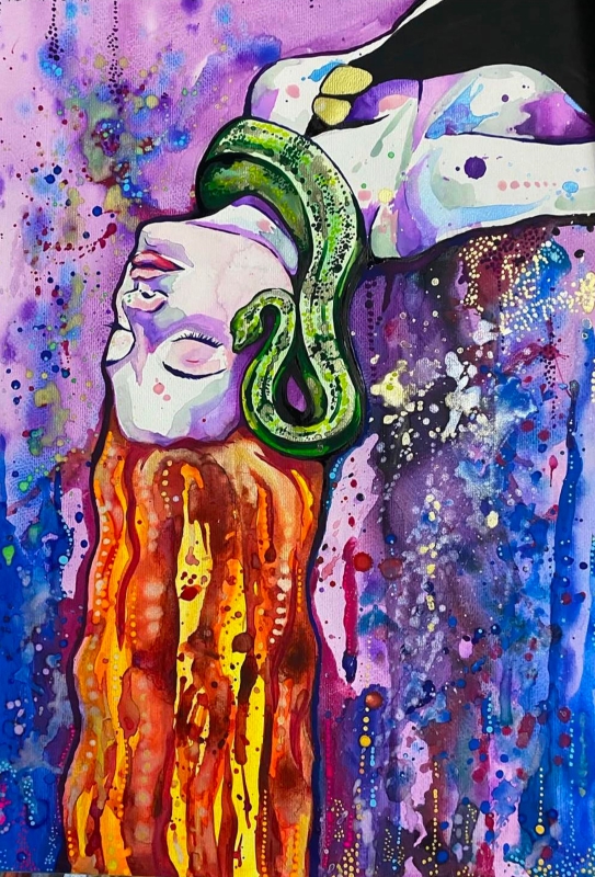 Reclined in colour, crowned by serpent and flame, she embodies the art of defiance. Here, surrender is not weakness - it is power, unapologetic and alive.