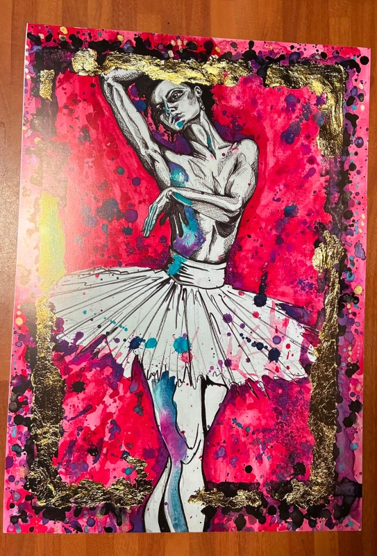 A dancer caught between discipline and wild abandon. Ink lines stretch with grace, splashes of pink and gold erupt around her, a stage of chaos she bends to her own rhythm.
