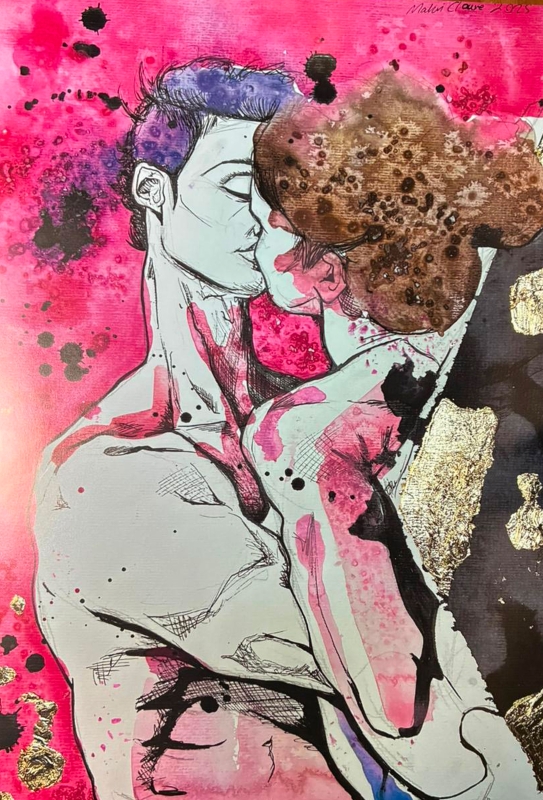 Where tenderness meets danger. A kiss drawn in lines that cut, colours that bruise.