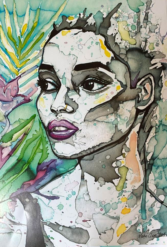 She blooms bold, her lips a petal-bright declaration, her gaze steady as sunlight through leaves. The jungle may whisper and shift around her, but she holds her ground - radiant, untamed, unforgettable.
