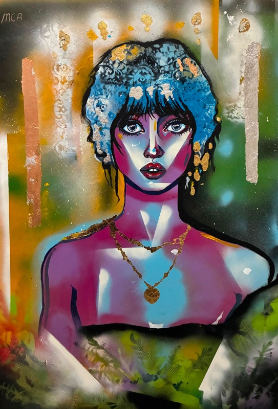 A dreamy mix of colour and gold, this portrait glows with emotion and mystery, drawing you straight into her gaze.