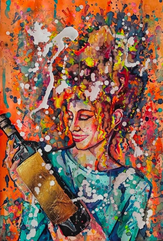 Bright splashes of joy - this playful piece celebrates love, laughter, and that perfect bottle of wine.